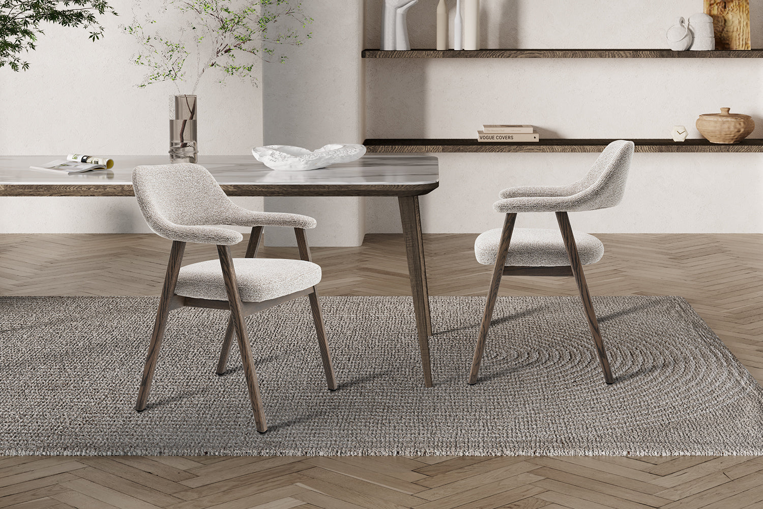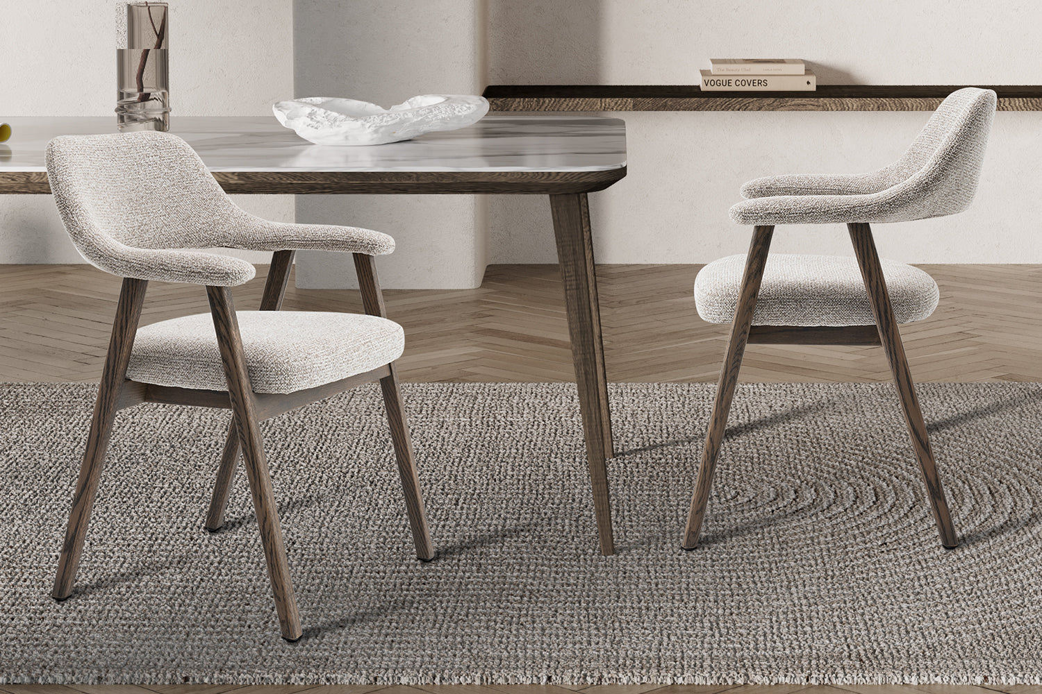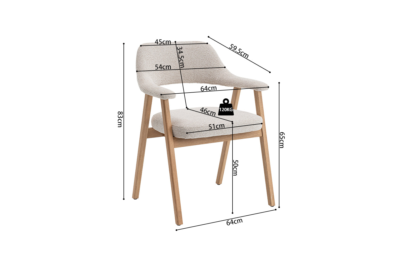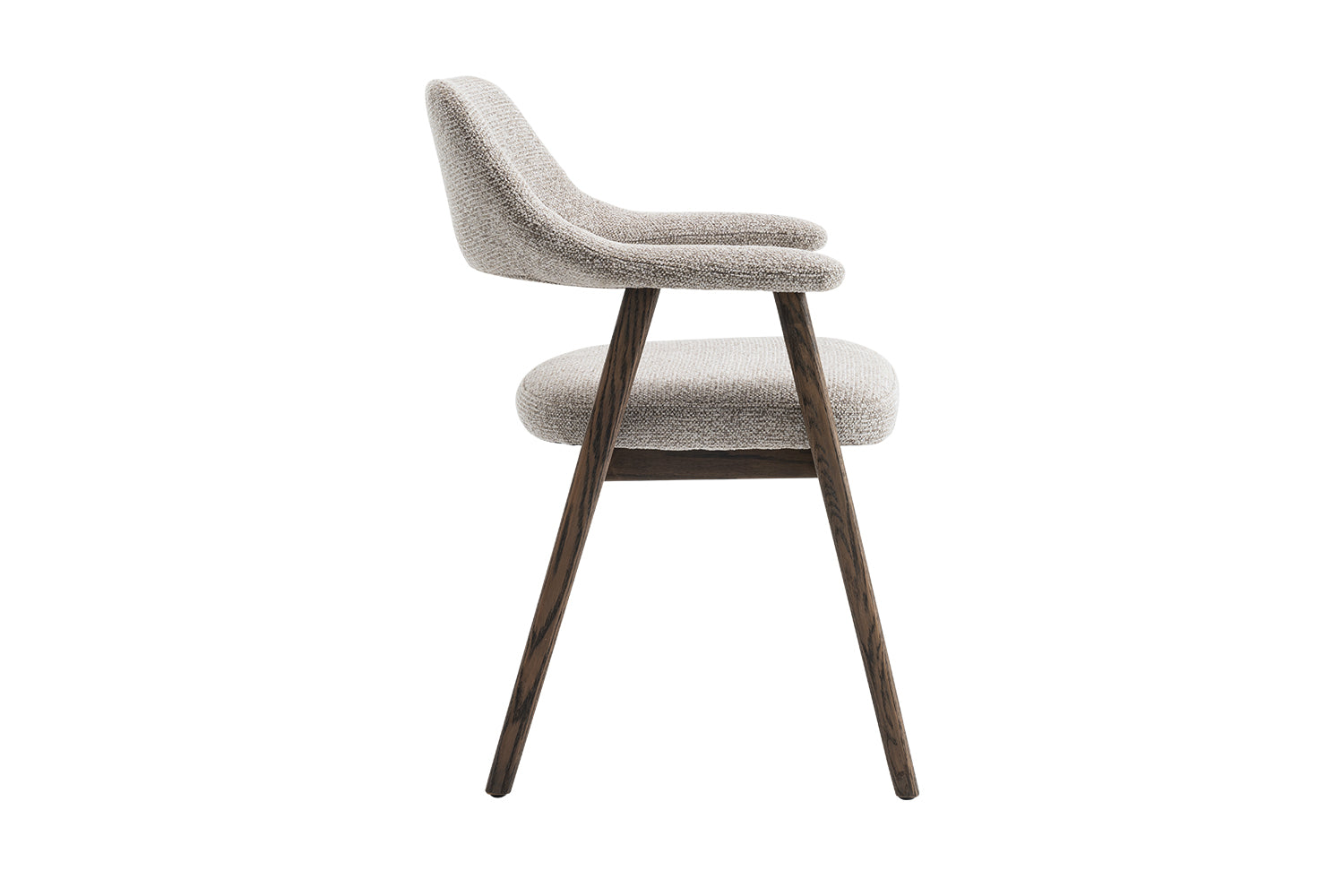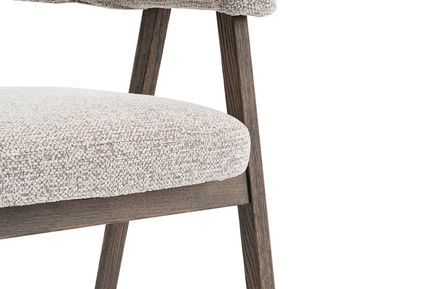 La chaise est constituée d’une structure et de pieds en chêne massif. Le chêne est un bois dur à feuilles caduques, à haute densité et très résistant à l’usure, ce qui contribue à la solidité structurelle et à la durabilité de la charge. Ce matériau présente un veinage marqué et est choisi pour sa résistance mécanique et sa longévité. L’assise comporte un noyau en MDF, un panneau de fibres de bois pressé sous haute pression et température, formant ainsi une surface homogène et stable.