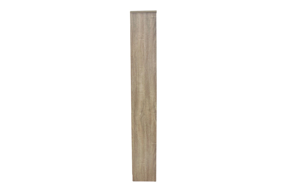 Le meuble à chaussures est fabriqué en panneaux de particules avec une finition en papier décor, offrant un aspect bois et une protection contre les petites rayures. Il dispose de quatre abattants avec compartiments à chaussures, chacun supportant jusqu’à 3 kg, ainsi que d’un compartiment latéral avec étagères, capables de supporter 4 kg par tablette. Un des panneaux latéraux est équipé d’un miroir intégré. Il est important de ne pas surcharger les tiroirs afin d’assurer leur bon fonctionnement.