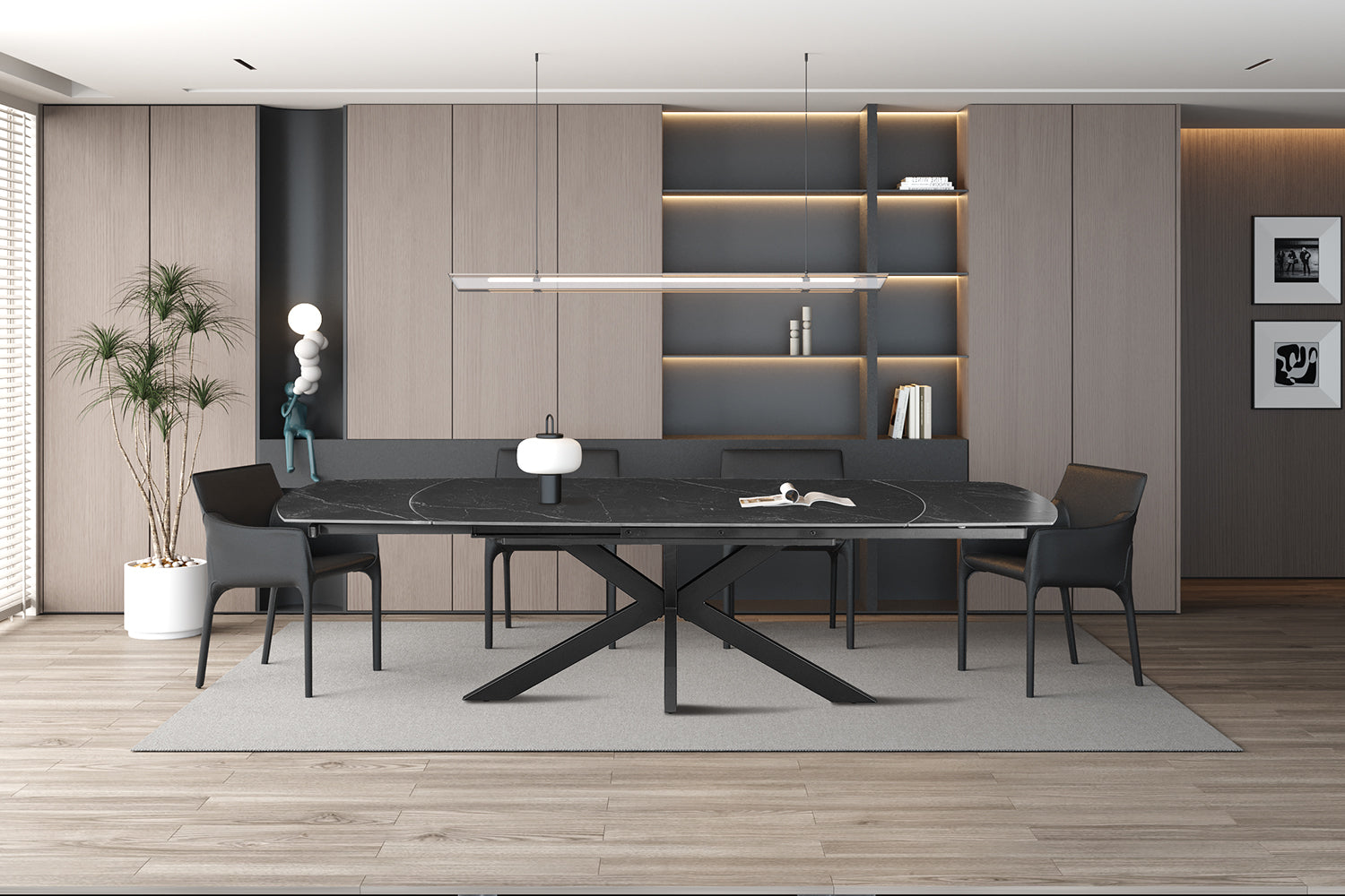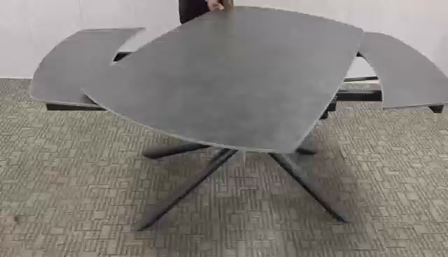 Cette table possède un cadre robuste en métal, recouvert d’une finition en poudre noire qui crée une surface mate, résistante à l’usure et à la corrosion. Le plateau est en Sintered Stone, ou pierre frittée. Ce matériau est composé de minéraux naturels, pressés et cuits à haute température. Le résultat est un plateau résistant aux rayures, à la chaleur et aux taches, facile d’entretien et extrêmement durable – idéal pour une utilisation intensive. La table dispose de deux rallonges séparées, que l’on peut facilement tirer à la main et repousser après usage. Cela rend l’extension de la table très pratique et flexible, permettant de créer rapidement de la place supplémentaire lorsque nécessaire, puis de la rendre tout aussi facilement plus compacte. Le système de rallonge fonctionne via un mécanisme rotatif ingénieux : en tournant la partie centrale de la table, les deux rallonges apparaissent automatiquement et se mettent en place. En tournant à nouveau, elles disparaissent discrètement sous le plateau. Ce système intelligent permet d’agrandir ou de réduire la table rapidement et simplement, sans effort supplémentaire.